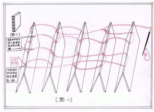 三, 用比较结实的细线按照(图一)那样把14组装订在一起(注:图一中的虚线代表订在书下面的部分,按照虚线就能找到整个这条线的走向。),要尽量将线拽紧一些使各组紧紧的成为一体,这个环节非常重要。订完后,用胶糨糊(一般的商店都有)将书顶涂满糨糊,然后用重物把涂完糨糊的书压紧,一直到糨糊干了为止。下一步就是用药店买的绷带在书顶脊上粘上一条,这样更能使装订的书坚固,和印刷厂的正规装订方法是一样的。接着再把《转法轮》后面的小节、目录、论语、法像和书皮儿粘上,再压紧。等完全干了后,用能一次切四五百张纸的大切纸刀(大切纸刀的价钱在300元左右)将书的三面切齐,这样一本新书就做出来了,几乎和我们的原装书一样好,而且这种装订方法做出来的书既美观翻看又非常方便,不象用订书器订出来的书翻看非常费劲。