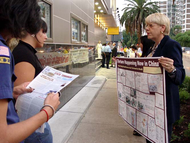 宾客们陆续来到。他们经过学员们身边时,跟学员善意的打招呼、微笑,有的停下来看真象展板,很认真的听学员们讲法轮功真象。