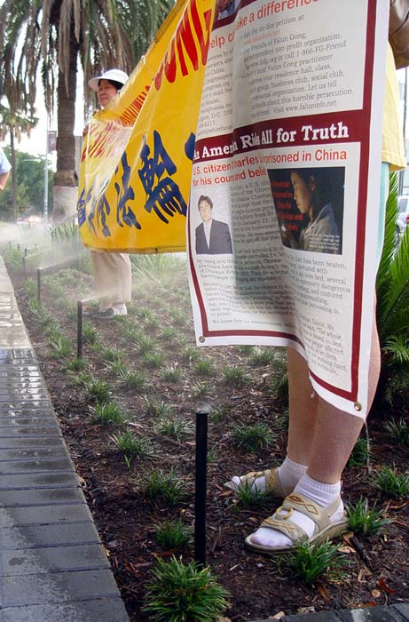 学员刚到,中领馆的工作人员就把花坛平常晚上才工作的喷水器打开,瞬间就淋湿了学员们的裤子和鞋。他们企图赶走学员,但是学员们依旧站在那里不动。领馆的工作人员看无计可施,只好作罢。