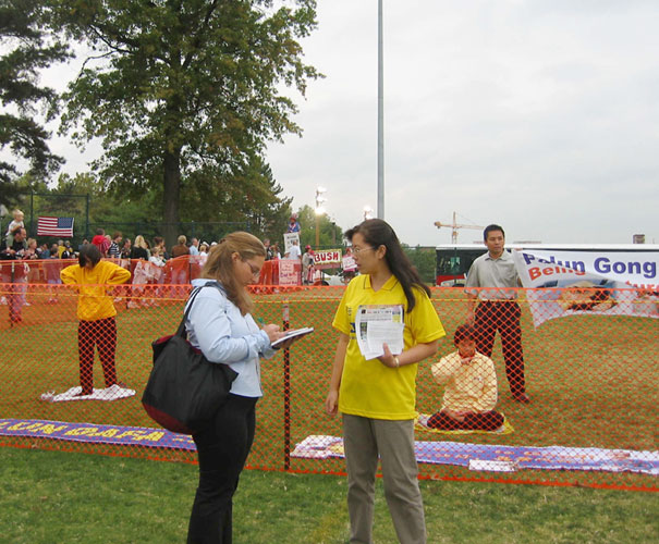 瑞士法轮功学员2004年10月2日在与德国毗连的夏弗毫森市市中心广场举行反酷刑展、洪法和炼功活动。反酷刑展吸引了很多人来了解发生在中国的迫害。一位印度妇女与学员聊了很长时间。她说:“我今年65岁了,法轮功很好,我觉得很喜欢。我今天终于找到了我长期寻找的东西。”