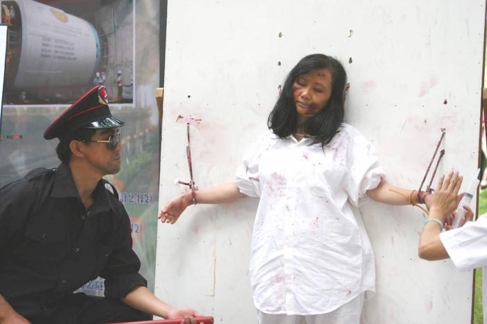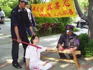 ◇聂海燕,化工专业硕士研究生,年轻美丽,因为坚持炼功,多次被绑折磨。2002年10-11月间,杨小蕾中队长看到她盘腿炼功,大怒,喝令戒毒人员吊绑她,挂在窗台上,她被吊了许久,嘴里又塞了东西,她真的很难受的时候,就在心里喊了声师父,立刻脚下绳索就松开了,她一活动手,也松开了,她挣了挣,就松绑了,人也下地了;同时房门打开了,另一个警察出现了,这个事就不了了之。
