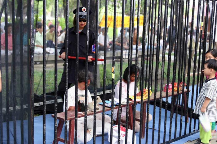 驻京办关了很多大法弟子,当我把在信访办讲真象的事告诉那些功友时,在场的十几位功友一边听一边哭,后来一位素不相识的功友交给我一面“真善忍永存”的大法横幅。我把这面横幅贴身藏好,之后我被押回武汉。这一次他们没有送我去看守所,而是把我关進派出所的铁笼子里。那些公安干警和街里的头头挖空心思讽刺我、辱骂我,我也没有动怒,只是觉得他们很可怜,三天之后,由于我坚决不交生活费就把我放出来了。