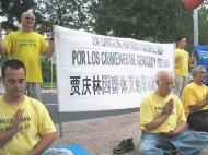 来来往往的行人很多,其中也有一些中国人,他们中有的是本地华侨,也有代表团的成员,学员们抓住这个好机会,向每一个路过的人讲真象,发放真象传单。有一位先生(中国人)接过传单后停住脚步认真地读起来,学员问他:“您了解法轮功的真象吗?”这位先生说:“我了解、了解,法轮功受了大冤屈了。我一直在关注这件事,这是有史以来最大的一场迫害啊!江××害死了那么多好人哪!我虽然不炼法轮功,但我知道法轮功非常正、非常好……我全力支持法轮功!”因为过往行人很多,很多人停下脚步观看真象图板和传单,并纷纷询问这里发生了什么?这位先生看到讲西语的学员人手不够,便主动向一名举横幅的西人学员要求,自己来替他举横幅,让这位能讲西语的学员去向人们讲真象。在傍晚美丽霞光的辉映中,我们看到这位先生与法轮功学员们站在一起,手持法轮大法的横幅,面色凝重、庄严。我们被深深感动了:这样一位觉悟了的生命,他已经为自己开创了一个无比美好的未来。