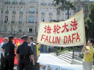 这时中方官员气急败坏地找到警官并向其施压,警官过来对我们说:“不可以高声呼口号, 否则我只好请你们到后面他们听不到的地方去!”还没等学员张口向这位警官讲真象,一位刚才已经听过学员讲真象的西班牙人已先一步来到警官面前,他严肃地对警官说:“你知道你在做什么吗?你是在帮助邪恶!这些和平的抗议者是受迫害者,而真正做坏事的人在那里(指贾庆林的方向)。那才是你应该管的!”警官退到一边不再吭声。不一会儿,警车也徐徐驶离遮挡我们的位置,使我们能够清楚地看到代表团的车队。代表团共有100多人左右,分乘四辆大旅游车,他们中有很多人还没有看到真象资料,法轮功学员们继续以口号的方式让他们听到真象:请记住法轮大法好、真善忍好、江泽民因迫害法轮功已在16个国家被起诉、天安门自焚是伪案…。只见车窗里的人们都在认真倾听,有的甚至向我们微笑或挥手致意。