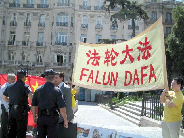 9月5日,贾庆林一行自巴塞罗那飞抵西班牙首府马德里。马德里的大法弟子在贾庆林下榻的旅馆前拉开横幅,并沿路摆放受迫害图片。向过往行人发放传单、讲真象。