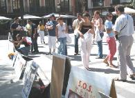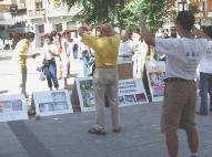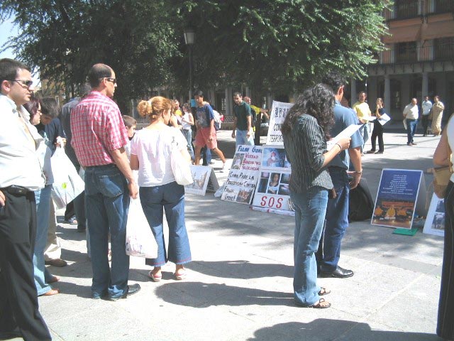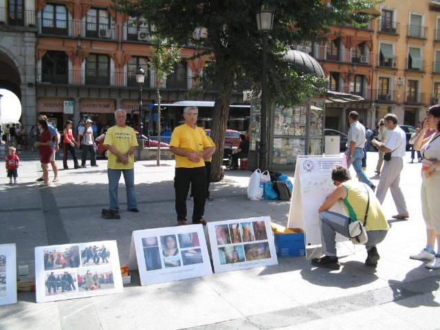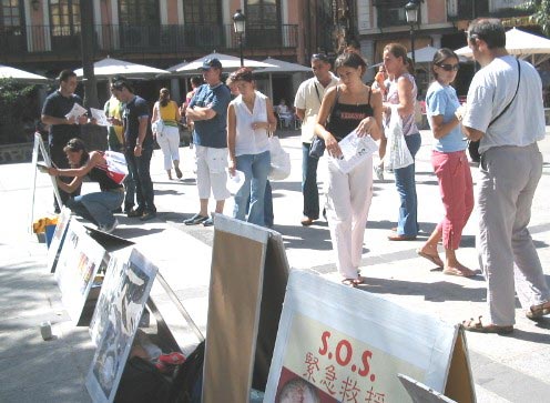 2004年9月6日上午,学员们来到TOREDO市洪法讲真象,发正念清除另外空间的邪恶。这里是贾庆林西班牙之行的第三站。TOREDO是西班牙著名古都,来自世界各地的游客很多。学员们在市中心广场摆放真象图片,演示功法,讲真象。游客们在了解了真象后,纷纷在签字板上签名表示声援法轮功学员,呼吁停止迫害。