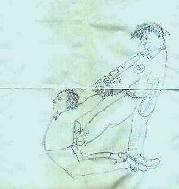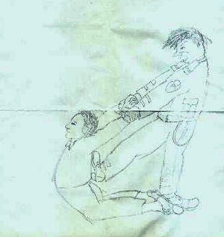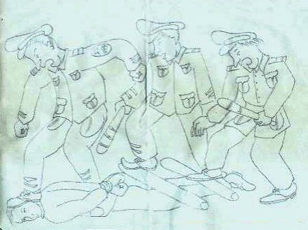 几个不知名的恶警,把我面朝下踢到在地,用穿皮鞋的脚踩住脸,然后把几根几寸粗的木棍放在大腿和小腿部位,几个彪形警察踏在木棍上滚来滚去的压腿。这种酷刑能够使人腿肚部位的肌肉严重分离,象糖葫芦一样,一节粗,一节细,受伤处呈黑紫色,胀痛难忍,严重的可导致腿残废。