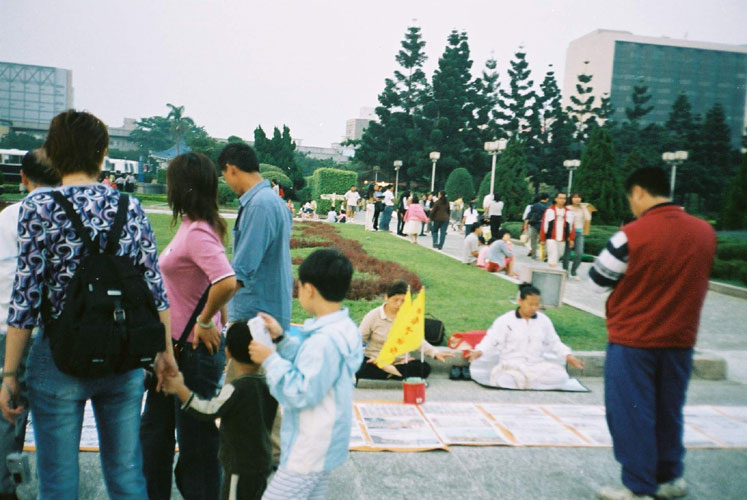 于是我们就移到瞻仰大道旁,一摆上法轮功真象展板,人们蜂拥而上,争相看着真象展板,一位带着小孩的妈妈对她小孩说:“看,真残忍,这些好人只不过炼功健身就(在大陆)被迫害成这个样子。”不久,一位警察也过来看,他说他知道法轮功好,有时间一定会来炼,同时好心的跟我们说,那边人更多,要不要移到那儿。