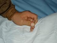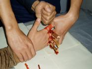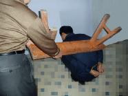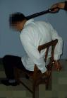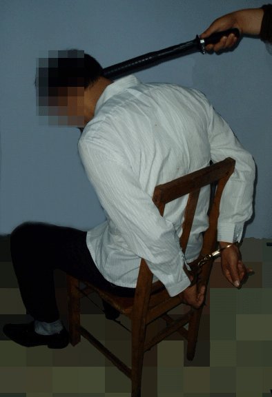 四、把法轮功学员背铐在刑椅上(铁椅子,没有真实道具,只能用普通椅子演示)一名犯人用脚踩住铐子中间的铁链,用力下蹬或猛踹,最后整个人都站在铁链上面。这时手铐勒紧腕骨,两臂、手腕最后麻木,无知觉;手腕被勒肿、变青、出血,同时警察和犯人或用皮带抽,疯狂殴打,浇凉水等。