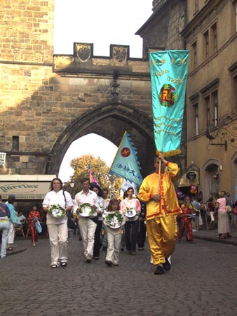 一些学员们化妆成酷刑受害者,手捧着在中国被迫害致死的学员的照片。许多游人向我们索取不同语种的资料,因为他们想更多的了解迫害的真象。一些人还加入游行队伍走了一段。那天的人非常多,很快就无法分清哪些是学员,哪些是游人。要资料的人太多了以至于学员们都来不及将资料发给每个想要资料的人。