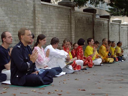 游行在中国大使馆前结束。在那里,女学员们用中文和英文演唱了优美的歌曲“为你而来”和“法轮大法好”。随后,所有的学员坐在大使馆对面的人行道上静静的守夜。