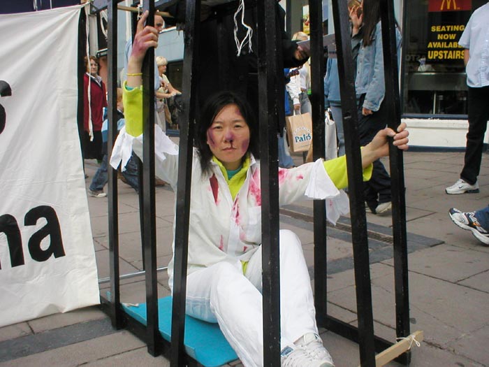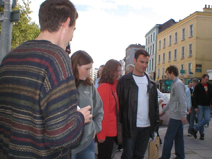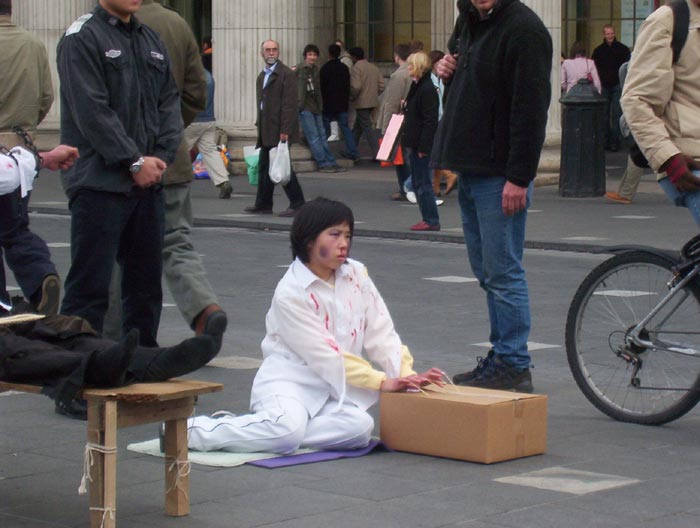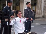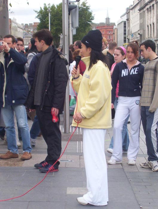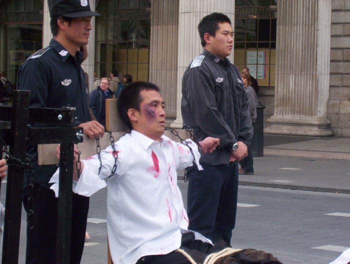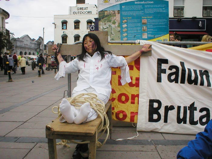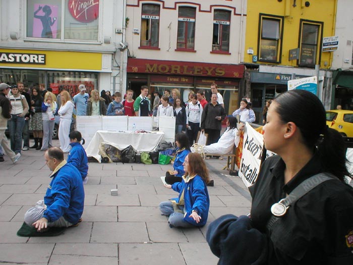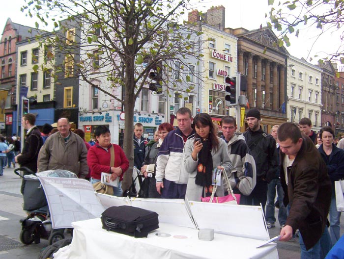 2004年10月8日,我们又在都柏林的街头办了第二次酷刑展。扮演受酷刑迫害的学员在寒冷的天气里,穿着单薄的衣服。观看的人们非常多,而且越来越多的中国人驻足观看并和我们学员交谈,这在以前是不多见的。可见正法进程的推进,邪恶已经少之又少了,它们连邪恶之首也维护不住了,恶首已经从它原来赖着不走的位置上被赶下来了,就更不能像以前那样控制世人了。