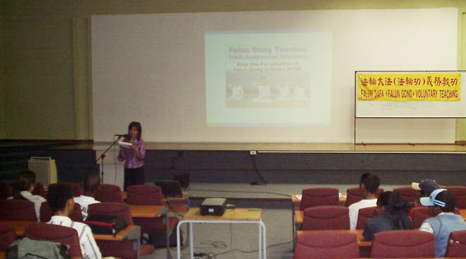 讲座的准备过程也是洪法,讲真象的过程。9月下旬,我找到学校的学生会,告诉他们我打算在德班理工学院建立法轮功的炼功点,义务教学校的师生炼功。他们非常欢迎。得知这么好的功法却在中国大陆被取缔,法轮功修炼者还遭受迫害,他们感到难以理解,并表示希望能尽快在德班理工建立法轮功炼功点。讲座的时间最后定在10月13日。