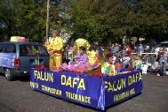 法轮功学员们装扮的色彩鲜艳的花车以及舒缓的功法表演吸引了众多观众,游行途中,人们沐浴在大法音乐的祥和之中,人群中不时发出一阵阵的掌声以及惊叹声,“中国人!”,“法轮功!” ,“真善忍” 人们迫不及待的接过学员们派发的介绍资料,认真的读着,孩子们也远远的伸出小手,索要精致的书签以及材料,再欢快的给父母看,他们似乎在说:“我得到了最宝贵的东西!”