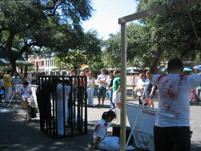 【明慧网2004年10月19日】2004年10月16日,德州奥斯汀大法学员和圣安东尼奥大法学员一起在圣城最有名的阿拉莫广场(ALAMO PLAZA)举行了酷刑展,引起诸多民众关注,当地的电视台FOX29前来采访。