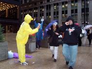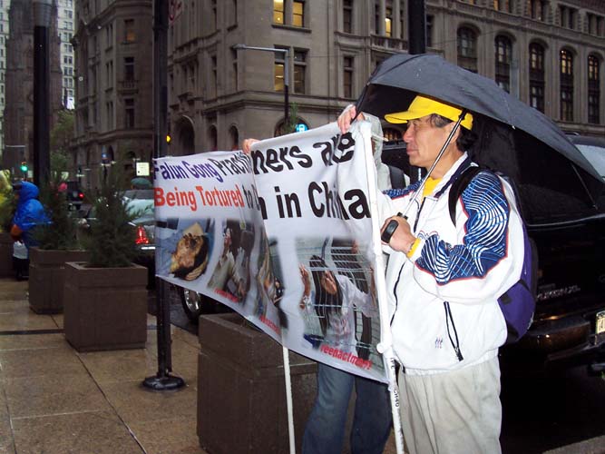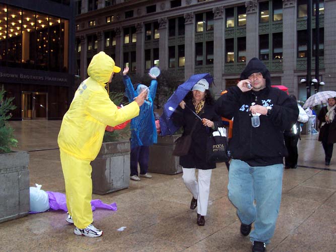 另一位学员Julia说,“今天风雨很大、很多路人的雨伞被风吹翻。”天气很冷,有很多学员的衣服被淋湿了,可是学员仍然坚持着。学员认为,江氏集团对法轮功的迫害已持续五年多。虽然它现在下台了,但邪恶仍然不甘心,还在垂死挣扎。迫害只要一天不结束,不管天气多恶劣,我们一定会继续揭露它的邪恶。