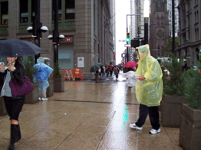17日的纽约已是暮秋,这个周末又赶上寒流,天气阴冷异常,人们也已穿上了冬装。我们两人身穿印有“法轮大法好”中英文字样的鲜黄色防雨衣,一位学员身穿鲜蓝色印有“法轮大法”字样的厚绒衣,一人高举酷刑展图片,两人在附近发放资料,三人一组的队形就在人群中缓缓移动。