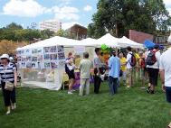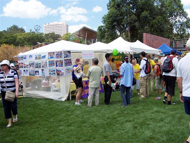 由于天气晴朗炎热,我们搭了2个帐篷--一个用来表演和教功,另一个用来发传单和教人们如何折纸莲花。我们还把迫害前在中国集体炼功的照片和大法在全世界,包括我们在昆士兰参加的许多五彩缤纷的游行和表演的照片挂起来,以展示大法的美好。