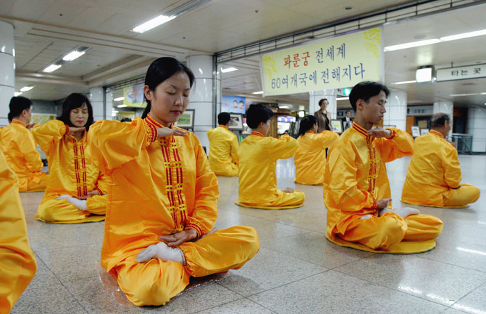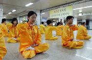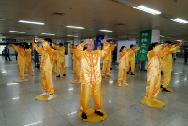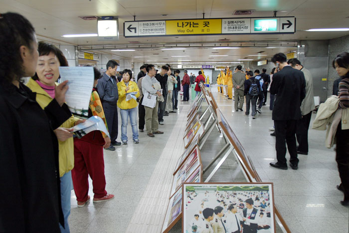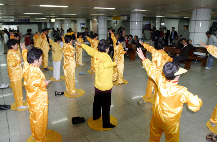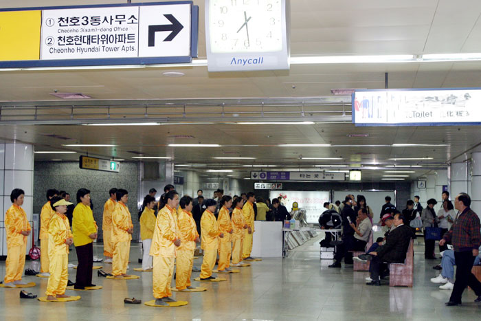 法轮功学员在舞台中央展示五套功法此次是应“汉城市都市铁道公社”江东驿地铁站的文艺活动负责人的正式邀请参加的,具体日程为从2004年10月20日(星期三)~10月22日(星期五),晚6~9点提供江东驿地铁站站内舞台,让学员们自由使用。许多同修不顾周中的繁忙, 来到江东站参加功法演示及洪法活动。20位身穿金黄色炼功服的学员在舞台中央简略的演示了五套功法。舞台后方设置了屏幕,在活动过程中放映了师父的炼功示范录像。舞台旁边摆放了洪法及讲真象照片,几名学员向来往的行人讲真象。