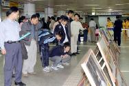 人们观看受真象照片,学员们在讲真象最近,与一般的洪法照片相比,受迫害真象照片更能引起市民的注意。通过站内的大部分市民都在认真的观看了炼功演示之后又领取了资料,有的则倾耳聆听学员们讲真象。江东站虽然往来人流不多,但能在宁静的氛围中观看炼功及照片, 所以这里是个可以深入讲真象的好地方。在这个时间段内路过的行人几乎都能确切的了解真象。