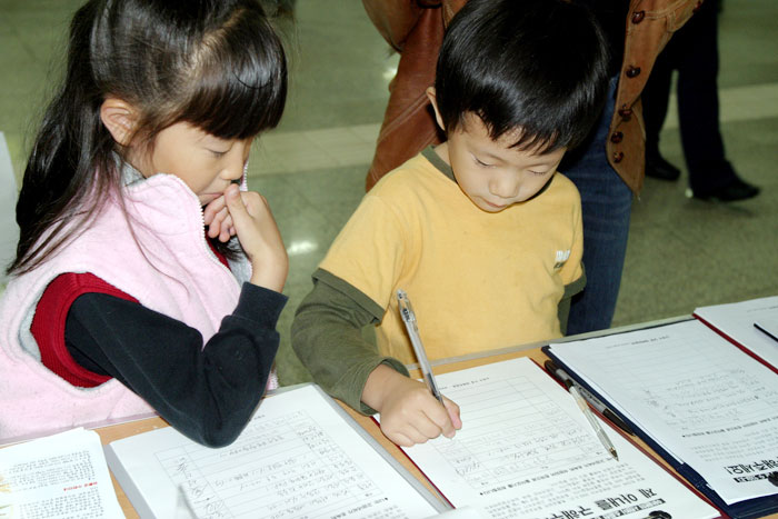 在舞台的另一侧,放置有签名台,为营救被监禁在中国的韩国人妻子--高成女,市民们自发的在此签名。大部分明白了真象的市民们主动询问在哪儿可以学功,其中许多人也在此签了名。