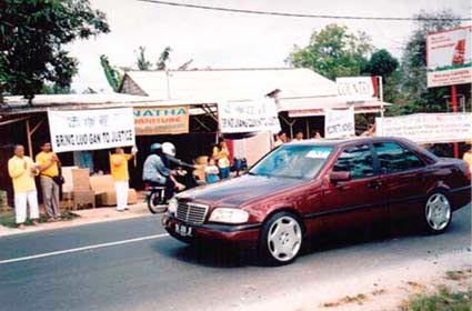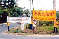 学员和平的抗议活动,既没有妨碍交通,又不用保安人员费神安排。受到保安人员的赞扬。一小时后,大约10点钟左右,欢迎活动结束,学员们还是整齐的站着,再次面向中国代表团展示上述横幅。