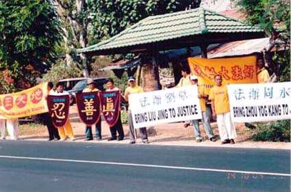这个抗议活动,目地是让世人知道,全世界都知道在大陆的镇压法轮功是恶首江泽民和他的同伙所干,希望来访的中方代表团把学员们的呼声带回去,让更多的人知道真象,唤醒内心的良知。法轮大法已经成为全世界人民的,全世界人民都可以自由炼功和传功。
