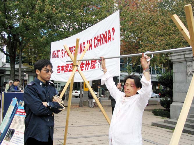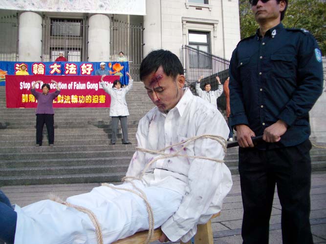 连续5个小时的酷刑展,学员们始终保持最好的精神状态。演示酷刑的学员一丝不苟,用自己的承受向世人展示中国法轮功学员遭受的迫害;化妆的学员认真负责,尽量做到逼真,以致常有观众走近演示者,问:你疼不疼?让我看看你的伤口。
