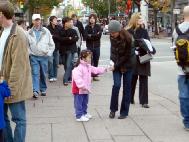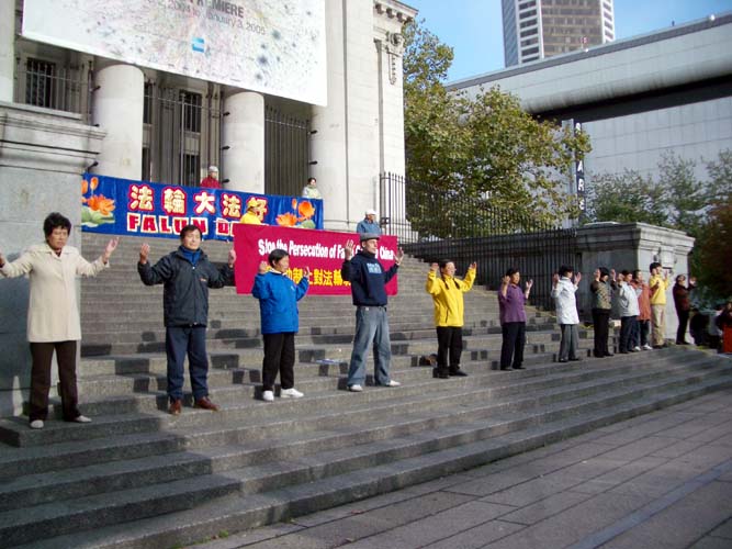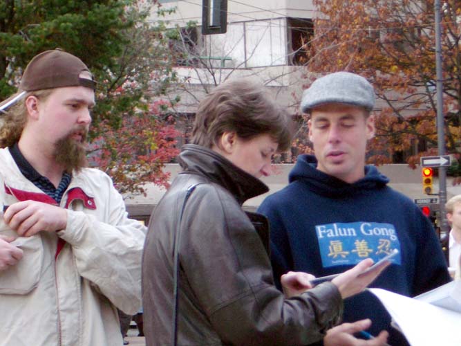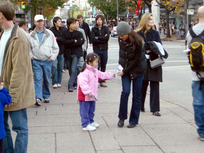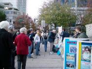 除不定期進行酷刑展以外,温哥华学员借鉴在纽约曼哈顿向世人讲清真象的做法,加强了向市中心商业区讲真象的力度,平时三三两两在DOWNTOWN 的主要街道、街口,摆上一块展板,炼功,发真象资料,效果也是非常好。