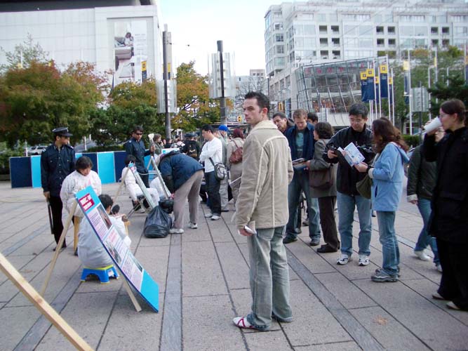 学员们一遍又一遍的向观看酷刑展的人们讲述着什么是法轮功及法轮功在中国受迫害的真象。法轮功学员小方说,讲真象中发现还有许多人不知道法轮功,他们常常问:法轮功是什么?看来我们讲真象还是很不够。