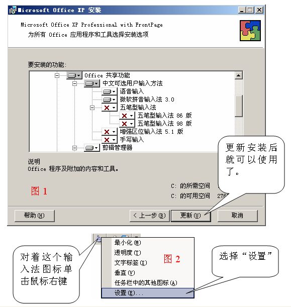 Office XP和Office 2003版本在安装时有语音输入法的安装,如图1。