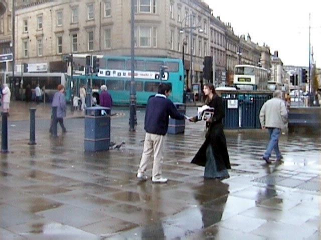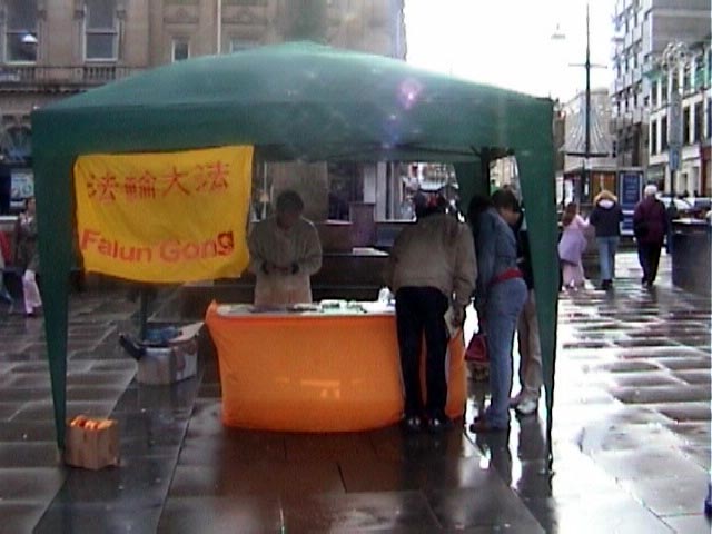 这天的天色比较阴暗,而且风雨交加。学员们的帐篷几次被刮倒,里面的铁支架在倒地中被撞弯。桌上的征签表、真象传单和VCD多次被风刮到地上。尽管如此,学员们依然坚持在雨中发传单、讲法轮功真象。许多路人得知在中国有上千名无辜的法轮功学员被酷刑折磨致死的消息后,都毫不犹豫的在呼吁营救被迫害的法轮功学员的征签表上签名。同时,也有许多人询问当地的教功点的情况。