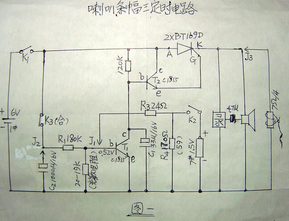 3. 电路工作原理:合上开关K2接通延时电路(7号1.5V电池开始放电延时约24小时晚上挂前再合K1),待电压降值T1三极管b极0.52V时管慢速关闭,T2管导通触发可控硅喇叭响。(也可把T1管换高速开关管2SC4452——4455都行,略贵)