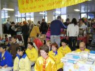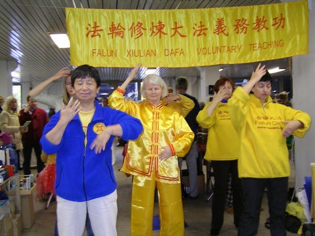 由四到八名学员组成队伍演示法轮功五套功法,非常吸引人,功法演示使环境变得祥和,人们显示了很大的兴趣。