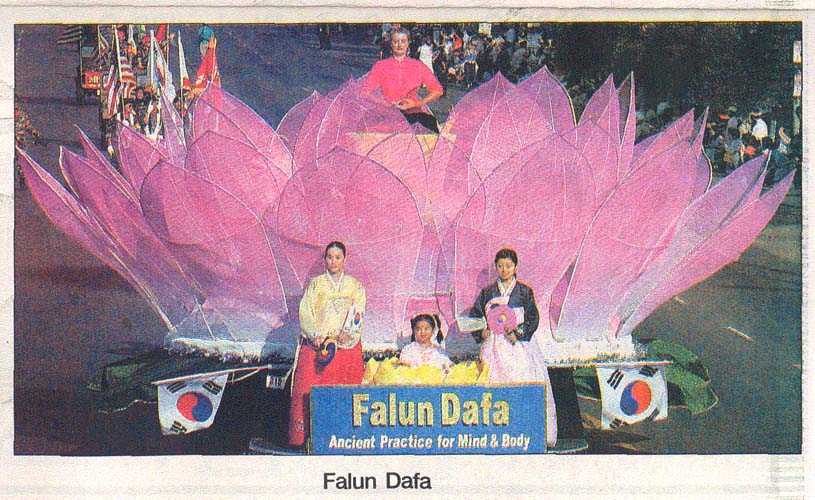 “哇!法轮功的队伍也来了!”有些韩国民众对法轮功还不是太熟悉。当法轮功学员出现时,观众们非常好奇。法轮功学员们穿着黄色的中国服饰,与装饰成莲花的优雅的花车一起出现在游行队伍中。李约翰,一位来自中国的留学生同时也是法轮功学员,自豪的表示:“为了准备参加游行,在杭庭顿海滩的一次游行前,我们用了一个月的时间自己制作装饰这部花车呢。”