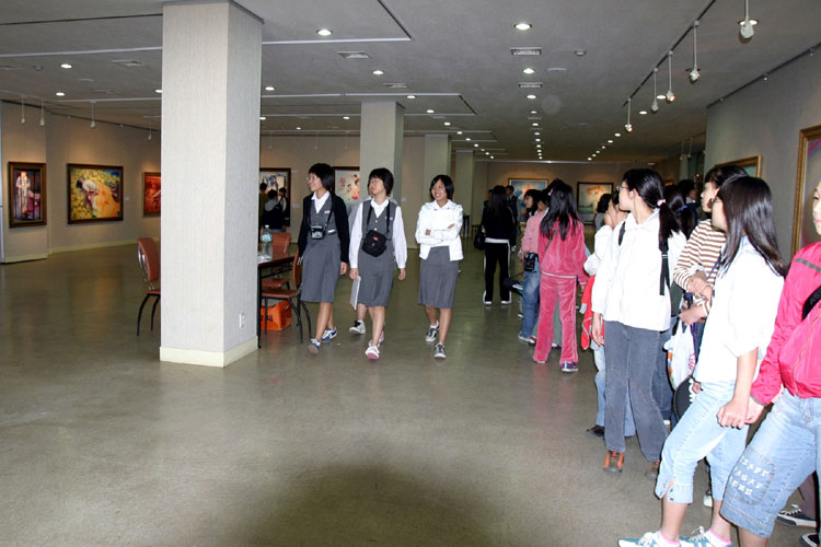 ![]() 向来宾解说画作 | ![]() 学生们集体观看画展 |