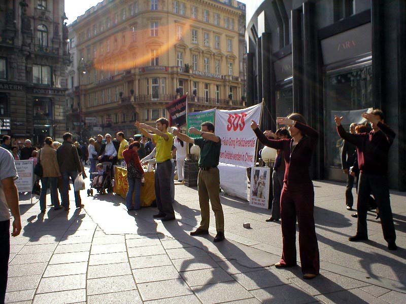 游客们看到在中国发生的酷刑的模拟表演时都十分震惊,在今天的社会上还有这样的事情发生。当人们看到在站在另一侧的法轮功学员们的功法表演时更是被震撼,学员们的祥和与在中国江氏集团对学员们施以的酷刑的对比太强烈了。人们纷纷向学员们了解迫害详情,索取关于法轮大法的介绍。不少维也纳的居民询问如何开始修炼。许多人自发在营救被关押的法轮功学员的签名表上签了名,并祝福学员们的反迫害努力成功。