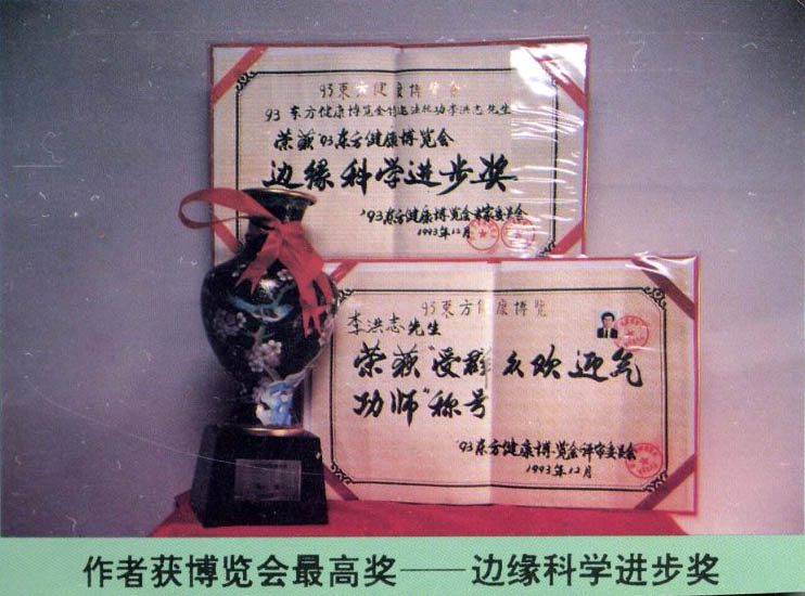 ![]() 93年北京东方健康博览会上,李洪志老师获博览会最高奖“边缘科学进步奖”,和大会的“特别金奖”,以及“受群众欢迎气功师”称号,在本届博览会上李洪志老师是荣获奖励最多的气功师。 |