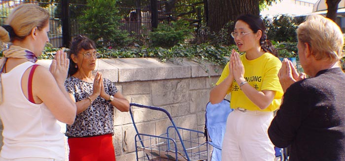 罗丝(Rose),一位来自俄亥俄州的中学教师,在联合广场向一群游人教授法轮功功法,其中一名妇女兴奋的说:“我找到了!我找到了!”这名激动的秘鲁妇女告诉罗丝她的一个梦。大约两个星期前的一天晚上,她梦到她的侄女告诉她自己病了,要炼五套功法。这位妇女百思不解,不明白这五套功法到底是什么?第二天,她打电话给侄女,发现侄女果然生病了,而且病得很重。她问侄女五套功法是什么意思,侄女说不知道。几天以后她来到了纽约,当她走在四十二大街时,一位法轮功学员递给她一份法轮功报纸,并用有限的英语说:“五套功法。” 这位妇女又惊又喜,惊的是世上真有奇迹出现,喜的是她终于找到了这个五套功法。