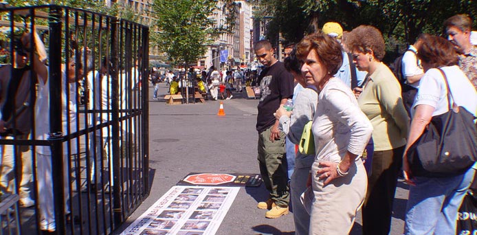 ![]() 露西亚教授在分发法轮功真象报纸。 | ![]() 人们参观在联合广场公园举办的酷刑展。 |