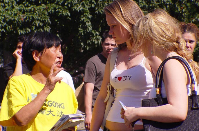 一次我们在一个小店买水果,店主人正在拨电话,当她看到我们身穿黄色的T恤衫手里拿着法轮功真象报纸时,马上对她的雇员(好像是个中国人)说:你知道吗?他们是炼法轮功的。你知道在中国迫害法轮功的事吗?那位雇员说不知道。于是这位店主人开始给她的这位雇员讲法轮功在中国所遭受的迫害。这时我们赶快把手里真象材料送给了她的雇员。在我们后面排队的一位美国妇女马上把手伸过来说:也给我一份材料好吗?我们赶忙把真象报纸递给了她。当时我们深受鼓舞。为有这样多的纽约人想了解真象,并在了解真象后还帮助我们向别人讲真象而感到由衷的高兴。