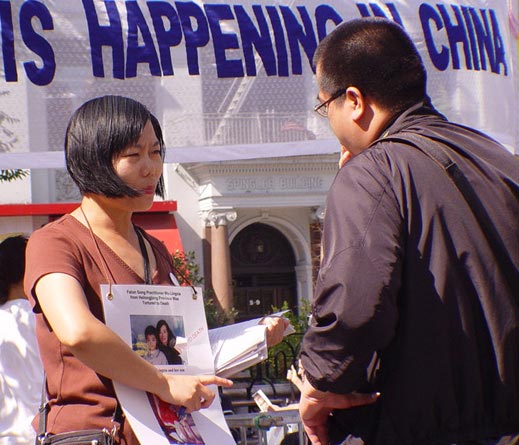 与其他团体的鼓噪形成鲜明对比的是法轮功学员的平和和理性,他们平静的向路人散发着介绍法轮功在中国被迫害故事的传单和报纸,并耐心的向每一位好奇或疑惑的询问者讲述中国法轮功学员被迫害的真象。而每一次的交谈都可以引出一个有趣而又动人的故事。