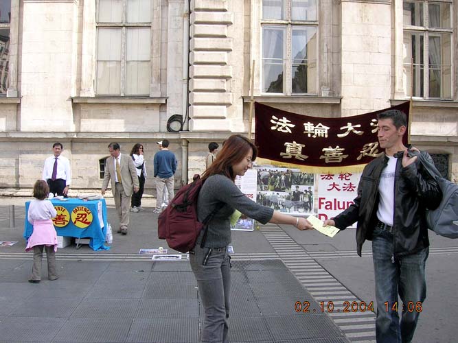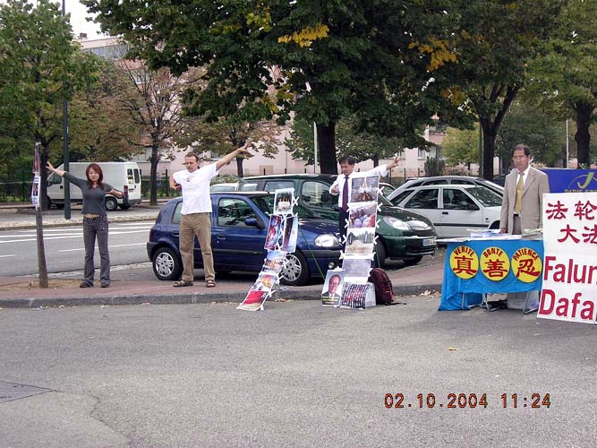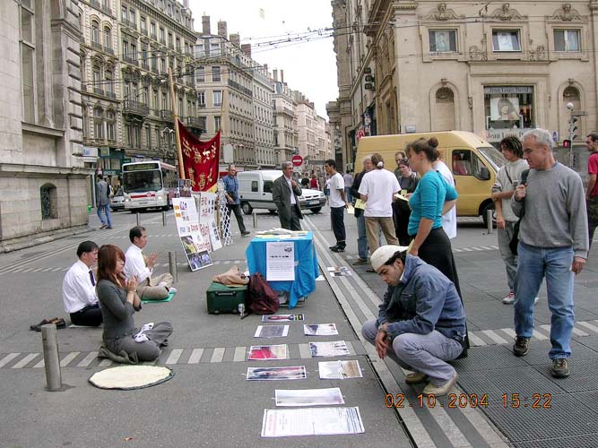 在里昂市政府前的情景就完全不一样了,在我们的展位上,学员们静静的炼功吸引了行人们驻足观看,很多人仔细的阅读那些在中国法轮功学员遭抓捕和酷刑虐待的图片说明。这一次,我们有很多的机会和人们做更进一步的交流,告诉他们法轮功是一种什么样的功法和为什么江泽民要镇压法轮功。这也是人们问的最多的两个问题。