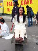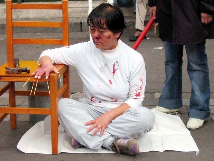 整个一下午,那些中国人和法国人都聚拢来观看这场模拟酷刑和图片展,现场还配有带麦克风的解说。人们纷纷索取法轮功的报纸。一些人被感动了,一位夫人含着眼泪说:“噢,你们知道么,看到这些让我感到非常痛苦。”另一个人说“他们怎么可以如此虐待这些从事着这样一件好事情的人们”。