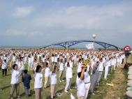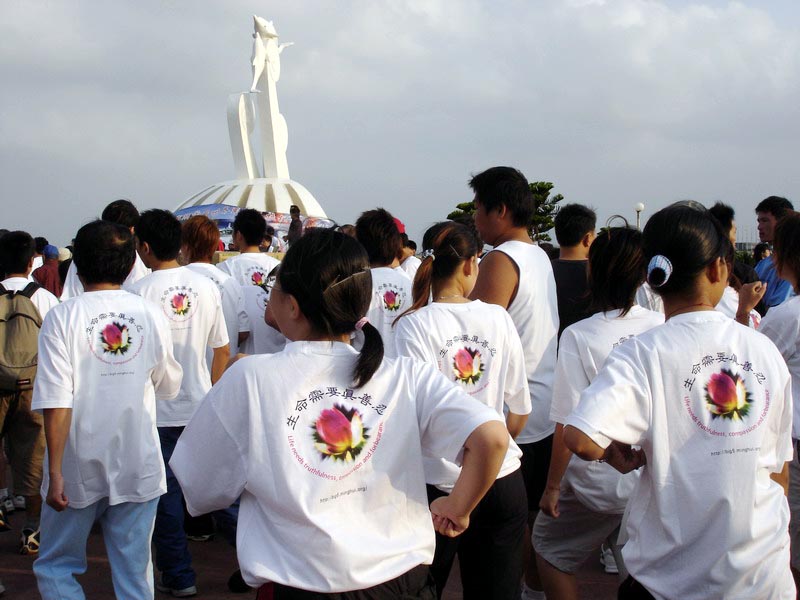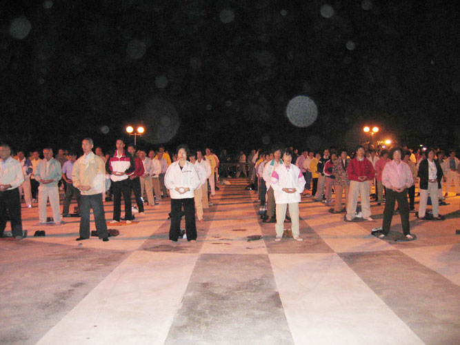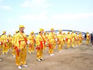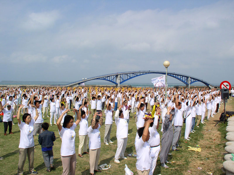 来自全省各县市共千名法轮功学员集体炼功,整齐、祥和的场更是当天节目的另一震撼。天音合唱团演出有女高音张佳慧助阵,把“法轮大法好”赞美诗的天籁之音在强劲的澎湖东北季风中传扬开来,由澎湖同修组成的飞天舞蹈团及台中小弟子的神韵舞蹈团演出都获得不少掌声。
