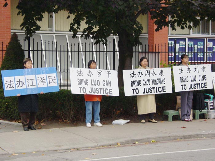 多伦多法轮大法发言人张照進先生在新闻发布会上宣读了声明,公布了迫害法轮功的几个元凶――江、罗、刘、周的主要罪行和法轮功学员将这些迫害法轮功的罪魁祸首绳之以法,伸张正义的决心。江××是这场这场长达5年、波及数亿人的迫害的直接发动者和指挥者,他出于妒嫉和对个人权力的保护,一意孤行发起了对法轮功的镇压,对数以千万计坚持信仰的中国法轮功学员实行“名誉上搞臭、经济上截断、肉体上消灭”,“打死白打、打死算自杀”、“不查身源、直接火化”的群体灭绝性政策。而罗干、刘京和周永康等人助纣为虐,积极策划、指使并在各地监督和推行了江氏发起的对法轮功的残酷迫害,双手同样沾满了无辜法轮功学员的鲜血,所以他们必须受到法律的严惩。