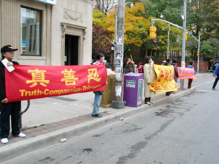 新闻发布会后,法轮功学员举着写有“法轮大法”,“真善忍”等字的各种中英文横幅和要求法办江罗刘周的标语,走上了附近交通繁忙的街头,让更多的加拿大人民了解这场迫害的真象,向全社会表达要求停止迫害,法办元凶的呼吁。