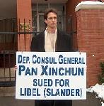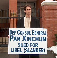 ![]() 图六、契普卡在多伦多中领馆外(标牌上写道:副总领事潘新春被控诽谤) |