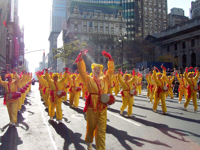 当天天气转暖,中午时分,太阳也露出了笑脸。老兵日游行是曼哈顿盛大游行之一,今年是第59届;有114个团体、约1万7千人参加;估计有超过10万的观众。游行队伍在曼哈顿著名的第五大道上行进。1百多位穿着黄色炼功服的法轮功学员在长长的队伍中格外显眼。