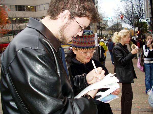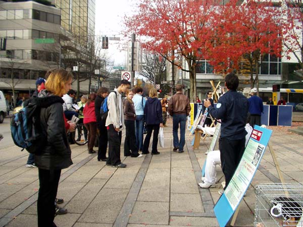 新闻发布会后,温哥华学员即在会场附近举办酷刑展及诉江明信片征签,使更多的加拿大人了解法轮功学员在中国受到的迫害,了解为什么要诉江。签名的民众络绎不绝。